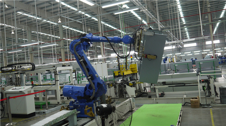 3、壓縮機自動化組裝。冰箱發(fā)泡后豎身45度、由機械手固定安裝壓縮機的工裝設備,目前已投入實際應用。機器人識別、搬取、固定壓縮機的裝備技術,改變了原先操作工身兼搬運工、甚至焊接工的情況,明顯降低了現(xiàn)場工人的勞動強度,成為冰箱生產(chǎn)自動化的重要環(huán)節(jié)之一。