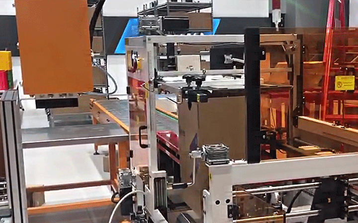 自動拆箱機(jī)自動完成開箱、成形、下底折葉折曲。并現(xiàn)時完成下部分膠帶粘貼,將疊成紙板的箱板自動打開,箱子底部按一定程序折合,并用膠帶密封后輸送給裝箱機(jī)的專用設(shè)備。