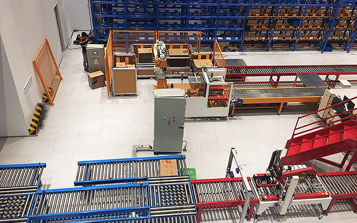 輸送裝置按貨物重量可分為重型和輕型兩種。重型輸送分揀線一般完成托盤類重型貨物的輸送,此類設(shè)備有重型滾筒機(jī)、鏈條機(jī)、頂升移載機(jī)、拆碼盤機(jī)、提升機(jī)、RGV、AGV等。輕型輸送分揀線主要用于輸送重量較輕的箱類、盒類貨物,在物流配送型的物 流系統(tǒng)中大量運(yùn)用,主要有滾筒機(jī)、皮帶機(jī)、提升機(jī)、定時功能移載等。