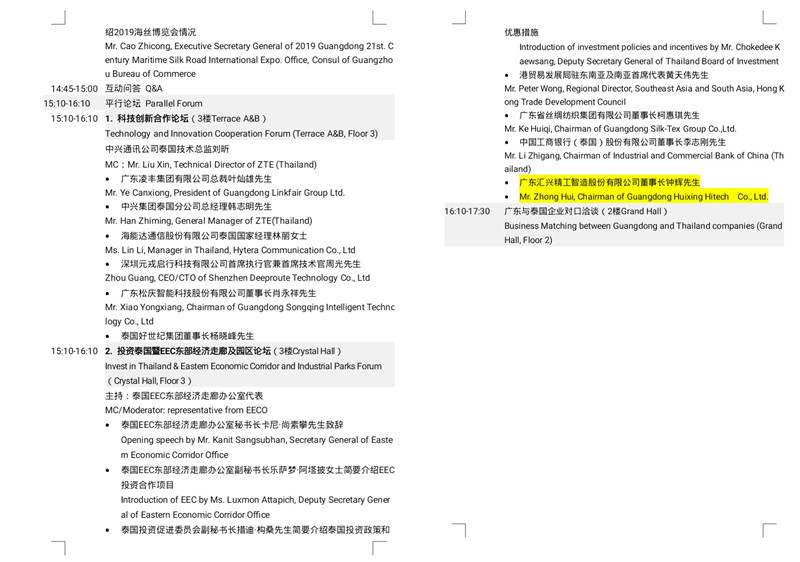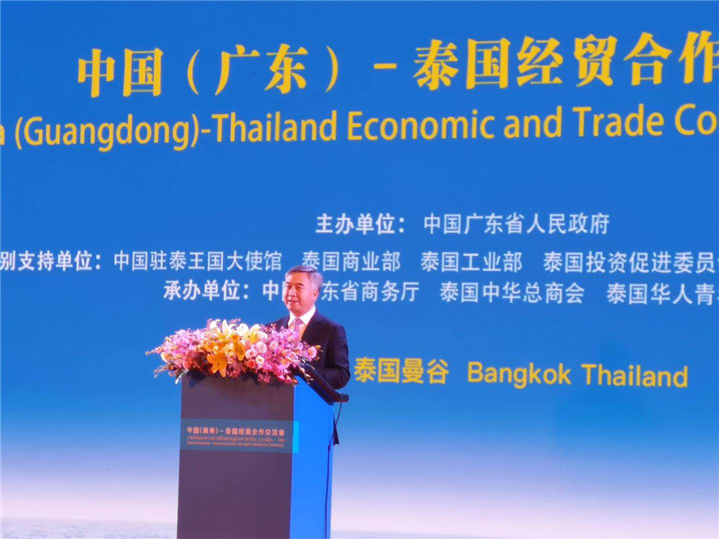 交流會(huì)上進(jìn)行粵港澳大灣區(qū)與泰國合作發(fā)展研討暨廣東省企業(yè)未來發(fā)展計(jì)劃介紹,廣東省商務(wù)廳副廳長(zhǎng)陳越華先生作主持。廣東省發(fā)展與改革委員會(huì)主任、推進(jìn)粵港澳大灣區(qū)建設(shè)領(lǐng)導(dǎo)小組辦公室主任葛長(zhǎng)偉先生帶來《共享粵港澳大灣區(qū)發(fā)展新機(jī)遇、推動(dòng)廣東與泰國合作發(fā)展》的主題分享,珠海格力電器股份有限公司董事長(zhǎng)董明珠女士、科大訊飛科大訊飛股份有限公司高級(jí)副總裁杜蘭女士介紹企業(yè)未來在泰國合作發(fā)展及投資計(jì)劃。交流會(huì)還進(jìn)行《粵港澳大灣區(qū)建設(shè)背景下粵港與泰國合作發(fā)展機(jī)遇》研討沙龍環(huán)節(jié),與泰國政商界代表共同探討促進(jìn)廣東和泰國雙方的交流與合作。