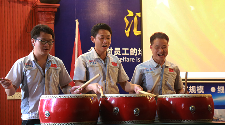 隨后,東莞分公司廠長(zhǎng)歐陽(yáng)輝鳳、智能裝備研發(fā)中心工程師鐘揚(yáng)、裝配測(cè)試技術(shù)員劉洋「三陽(yáng)開(kāi)泰」共同敲響士氣鼓、鼓舞匯興智造奮勇前進(jìn)。