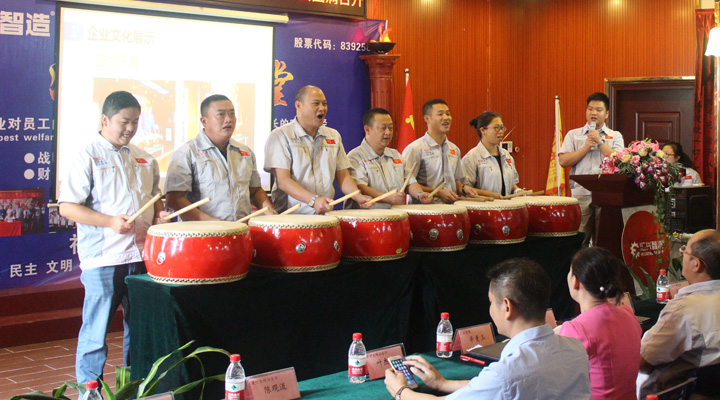 會(huì)議開(kāi)始,全體員工整肅衣冠端身正意滿(mǎn)懷赤誠(chéng)之心向企業(yè)“孝道、商道、人道”行三鞠躬禮,宣讀企業(yè)愿景——成為全球領(lǐng)先的整廠自動(dòng)化系統(tǒng)解決方案提供商,企業(yè)使命——做受尊敬的好人、造受尊敬的產(chǎn)品、辦受尊敬的企業(yè)、建受尊敬的平臺(tái),企業(yè)精神——用情做人、用心做事,團(tuán)隊(duì)精神——忠誠(chéng)團(tuán)結(jié)、勤奮進(jìn)取。隨后,匯興智造高管:鐘世鑫、胡偉路、呂常垣、黃艷、廖飛、張強(qiáng),共同敲響士氣鼓、鼓舞匯興智造奮勇前進(jìn)。