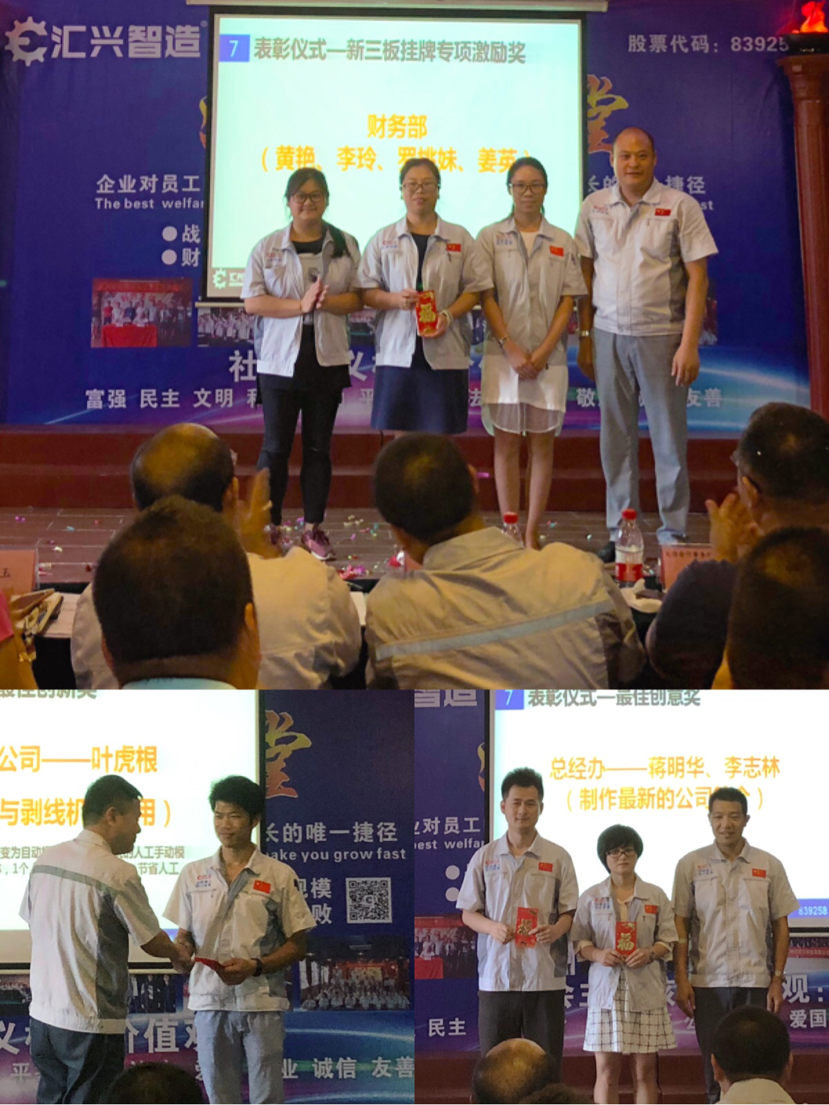 隨后舉行新員工入職歡迎儀式,每個(gè)月份都會(huì)有各個(gè)領(lǐng)域的人才加入?yún)R興智造這個(gè)大家庭,企業(yè)的快速發(fā)展需要更多的人才輸入,堅(jiān)信在匯興智造,定能營(yíng)造愈加廣闊的舞臺(tái),各位新老員工在這里都能遇見(jiàn)最美麗的自己。同時(shí)對(duì)公司有重大貢獻(xiàn)的各位同事進(jìn)行頒獎(jiǎng)儀式,包括新三板掛牌專(zhuān)項(xiàng)激勵(lì)獎(jiǎng)、最佳創(chuàng)新獎(jiǎng)、好點(diǎn)子獎(jiǎng)、新聞撰寫(xiě)?yīng)?、人才推薦獎(jiǎng)、最佳創(chuàng)意獎(jiǎng)。
