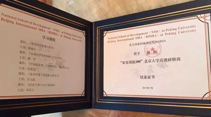 同時,經(jīng)過一年的學(xué)習(xí)和相處,“家電領(lǐng)航100”北大班的同學(xué)們迎來了結(jié)業(yè)的日子。匯利興集團(tuán)董事長鐘輝為此次畢業(yè)學(xué)員,中國慧聰家電城董事總經(jīng)理宋冰晨先生為“家電領(lǐng)航100”北大班的同學(xué)們頒發(fā)結(jié)業(yè)證書。