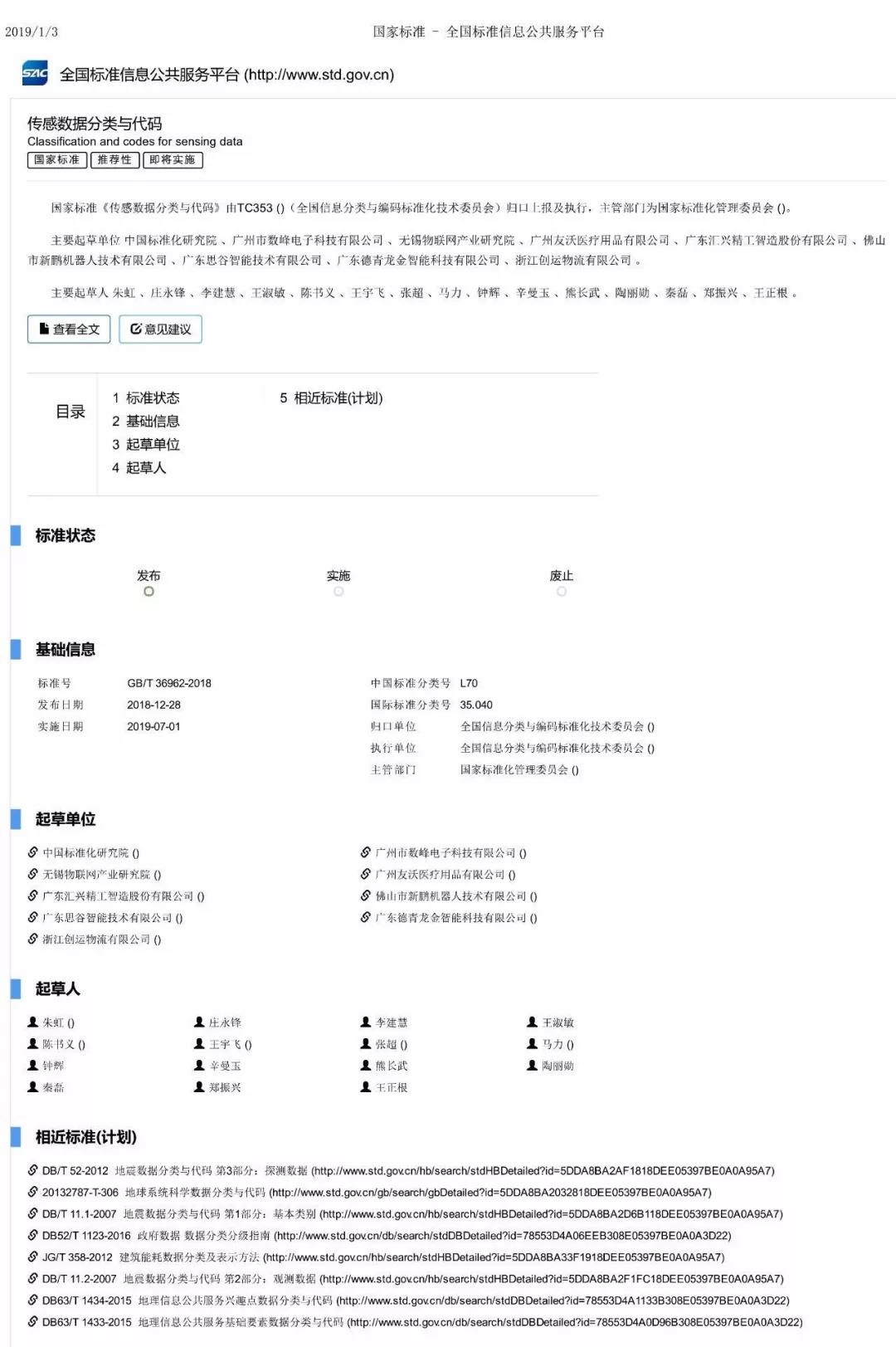 1月10日,國家市場(chǎng)監(jiān)督管理總局、國家標(biāo)準(zhǔn)化管理委員會(huì)發(fā)布了《中華人民共和國國家標(biāo)準(zhǔn)公告》2018年第17號(hào)。由匯興智造參與起草的國家標(biāo)準(zhǔn)《傳感數(shù)據(jù)分類與代碼》獲準(zhǔn)公布,并將于2019年7月1日開始實(shí)施。
