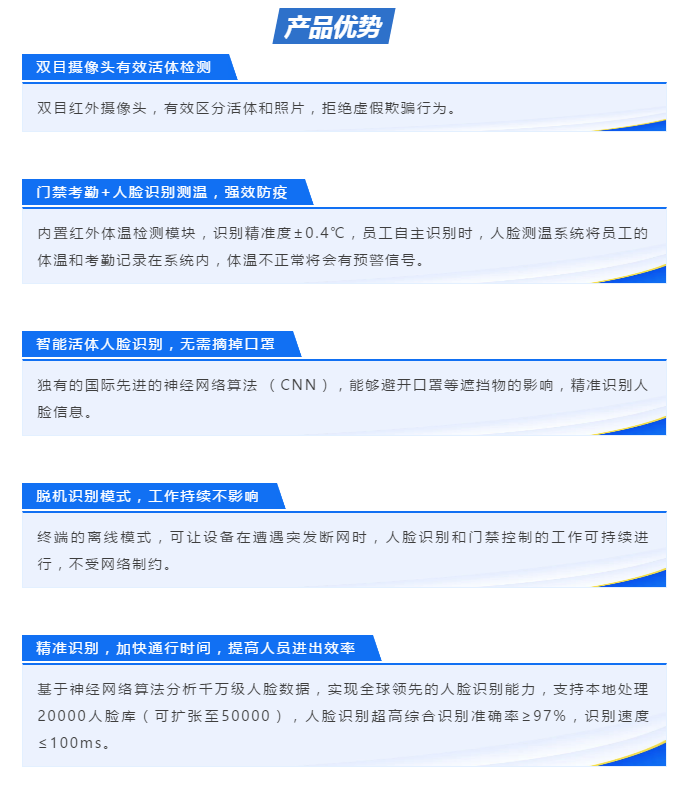 用國際先進(jìn)的神經(jīng)網(wǎng)絡(luò)算法 (CNN), 是經(jīng)數(shù)千萬次的算法訓(xùn)練后形成的產(chǎn)品,其集圖像采集、人臉檢測(cè)、人臉跟蹤和人臉比對(duì)等功能,不僅識(shí)別率高,同時(shí)識(shí)別速度快。值得一提的是,這款設(shè)備可以輕松識(shí)別出戴口罩的人臉信息,非常適合作為此次疫情防控的有力工具。
