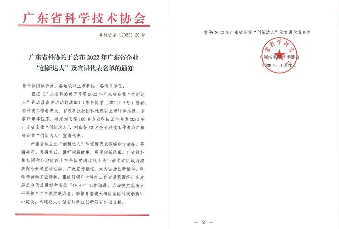 ”講好創(chuàng)新故事 、 展現(xiàn)創(chuàng)新風(fēng)采“2022年11月15日,由廣東省科學(xué)技術(shù)協(xié)會開展的2022年廣東省企業(yè)“創(chuàng)新達(dá)人”評選活動中,經(jīng)科技工作者申
