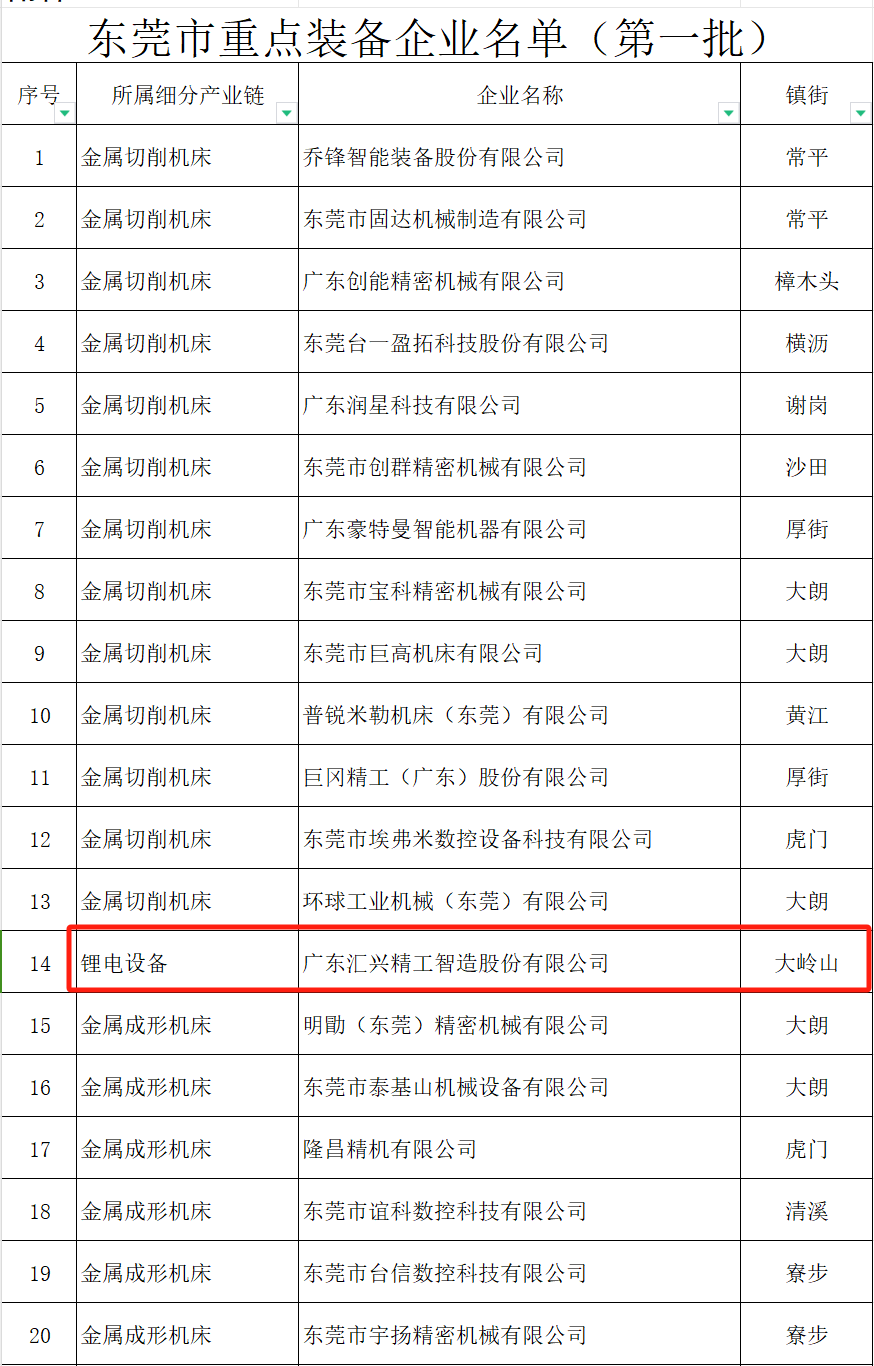 ▲ 廣東匯興精工智造股份有限公司非常榮幸進(jìn)入2024年首批“東莞市重點裝備企業(yè)”名單(是大嶺山鋰電設(shè)備唯一入選單位)。